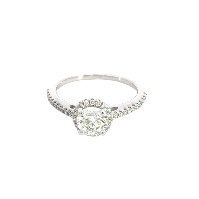 14K White Gold 1 1/4ctw Diamond Halo Engagement Ring, Center GIA 7221781943 Round .90 JSI2 GDEXVG NoneProduct Family: Rings Metal Type: 14K White Gold Color: J Clarity: SI2 Gram Weight: 2.7 Diamond Total Weight: 1.25 Gender: Women's