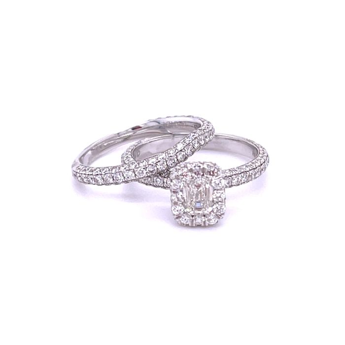 14K White gold 2 1/4ctw Diamond Pave Wedding Set with 1/2ct Emerald CenterProduct Family: Rings Metal Type: 14K White Gold Color: GHI Clarity: SI1 Gram Weight: 4.9 Diamond Total Weight: 2.27 Gender: F
