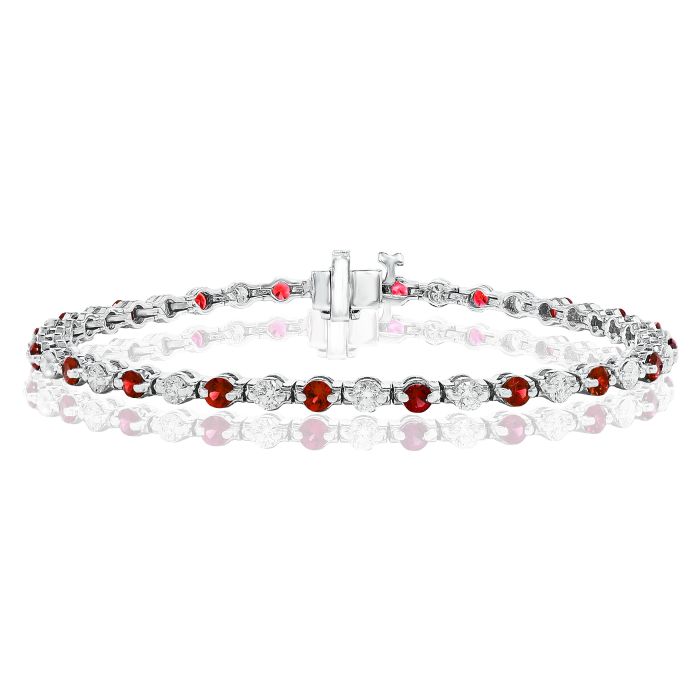 14K White Gold Bracelet with 1.75ctw Diamonds and 2.25ctw RubiesProduct Family: Bracelets Metal Type: 14K White Gold Color: GH Clarity: SI Gram Weight: 9.2 Diamond Total Weight: 1.75 Gem Stone Type: Ruby Gem Stone Weight: 2.25 Gender: Women's