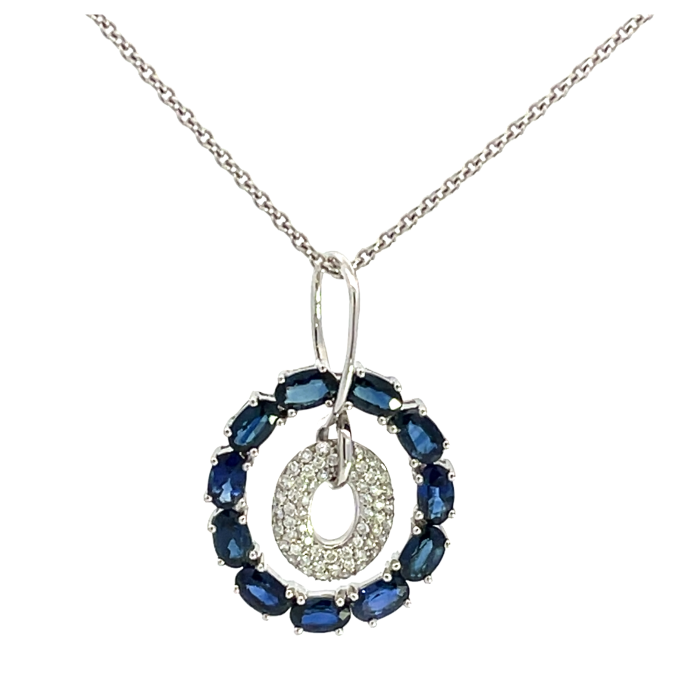 18K White Gold 3.75ctw Blue Sapphire and 0.22ctw Diamond PendantProduct Family: Pendants Metal Type: 18K White Gold Color: GH Clarity: VS Gram Weight: 6.84 Diamond Total Weight: 0.22 Gem Stone Type: Sapphire Gender: Women's